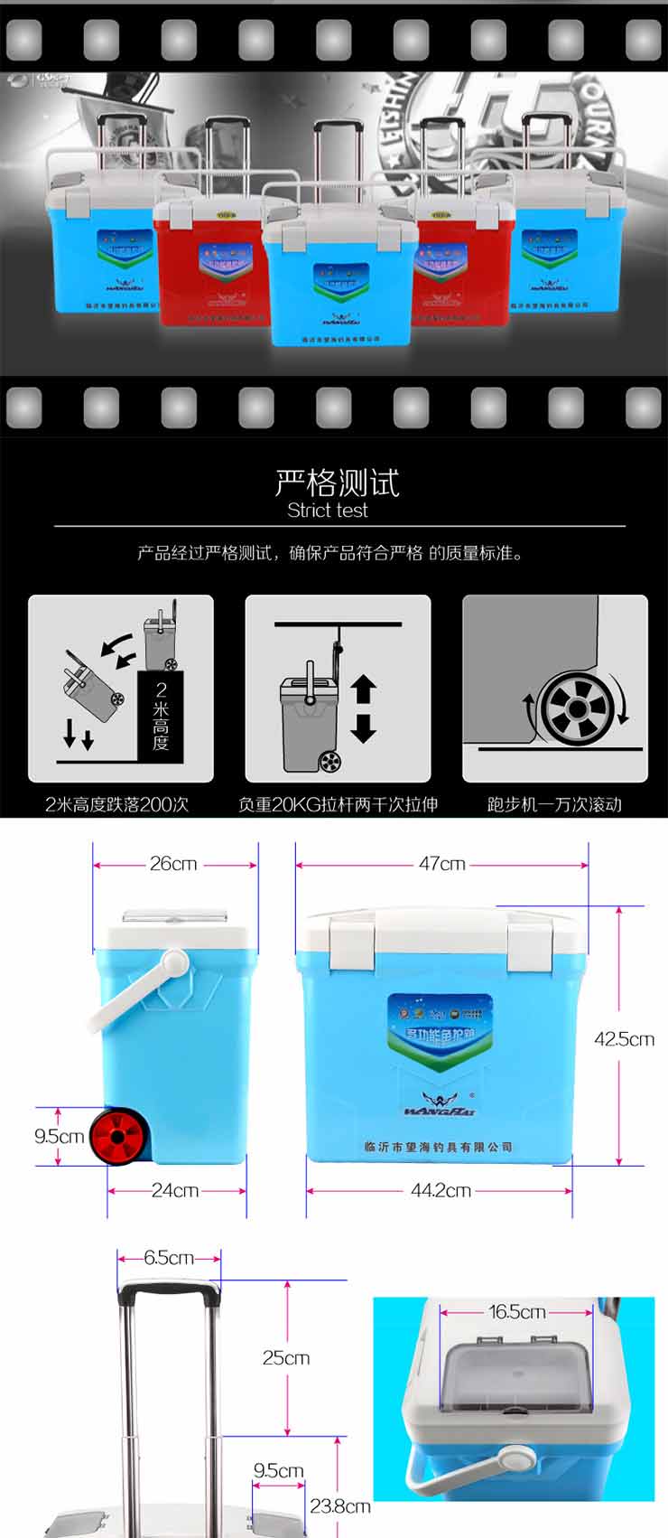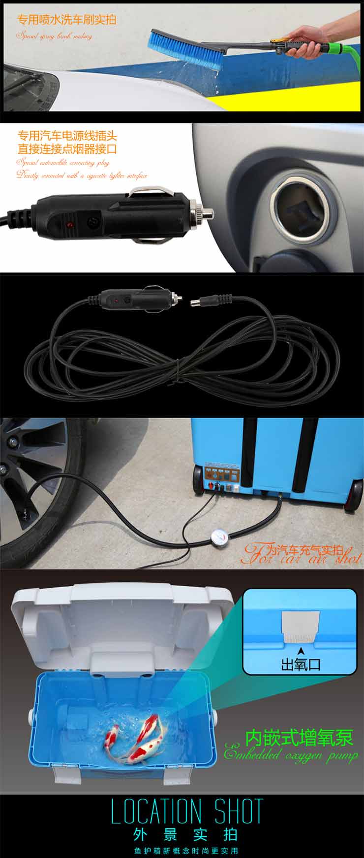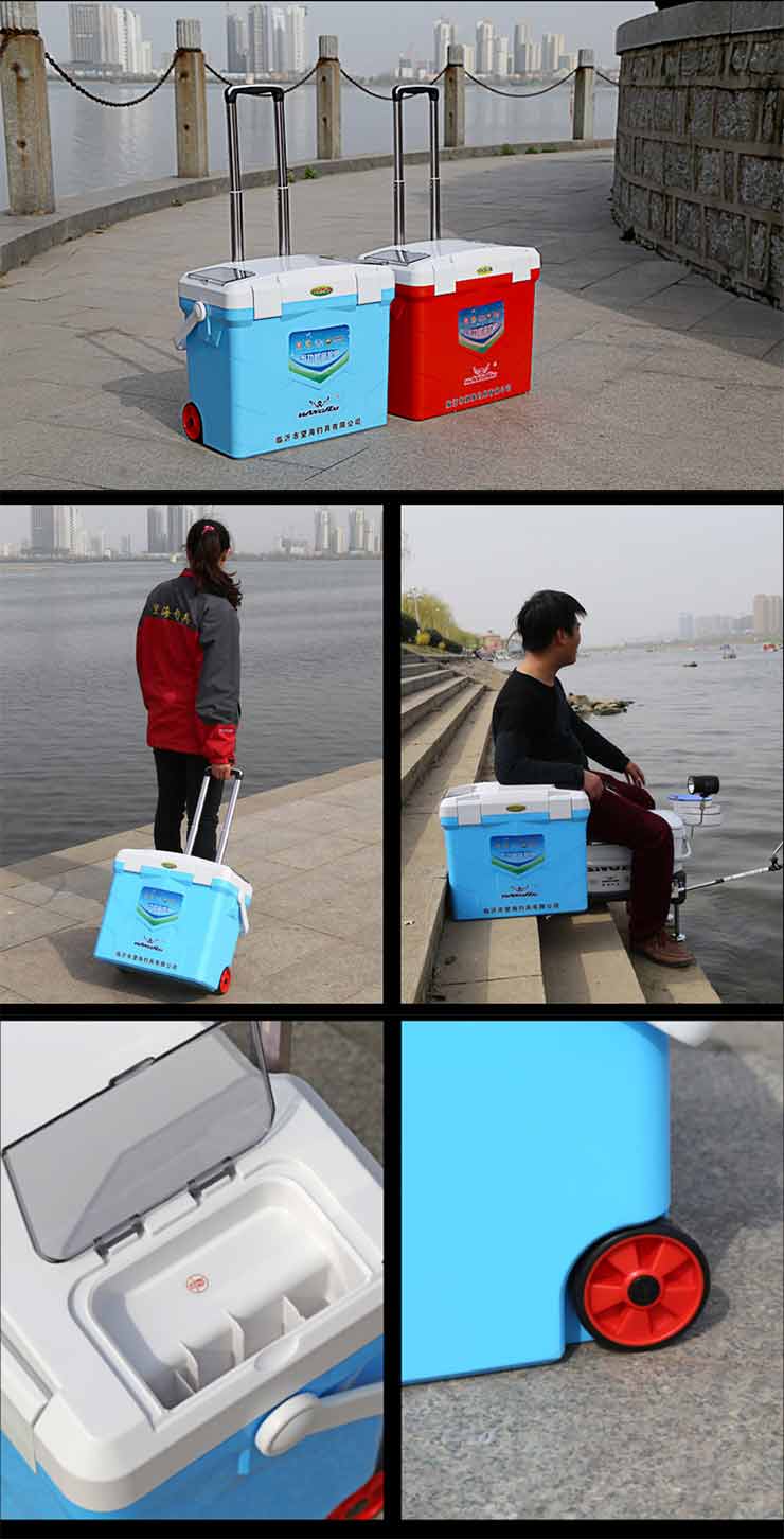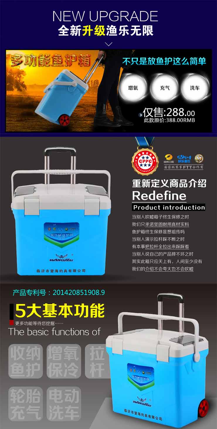 多功能魚護箱,整合了釣箱、魚護桶、活魚箱、行李箱、洗車機等功能。配置3.7V增氧泵、移動電源、可以增氧;又新增加了拉桿車輪設(shè)計,提手背帶一應(yīng)俱全,也可作行李箱或車載工具箱使用;還配置了洗車泵、輪胎充氣泵、可以連接車載12V電源給汽車輪胎充氣、洗車。